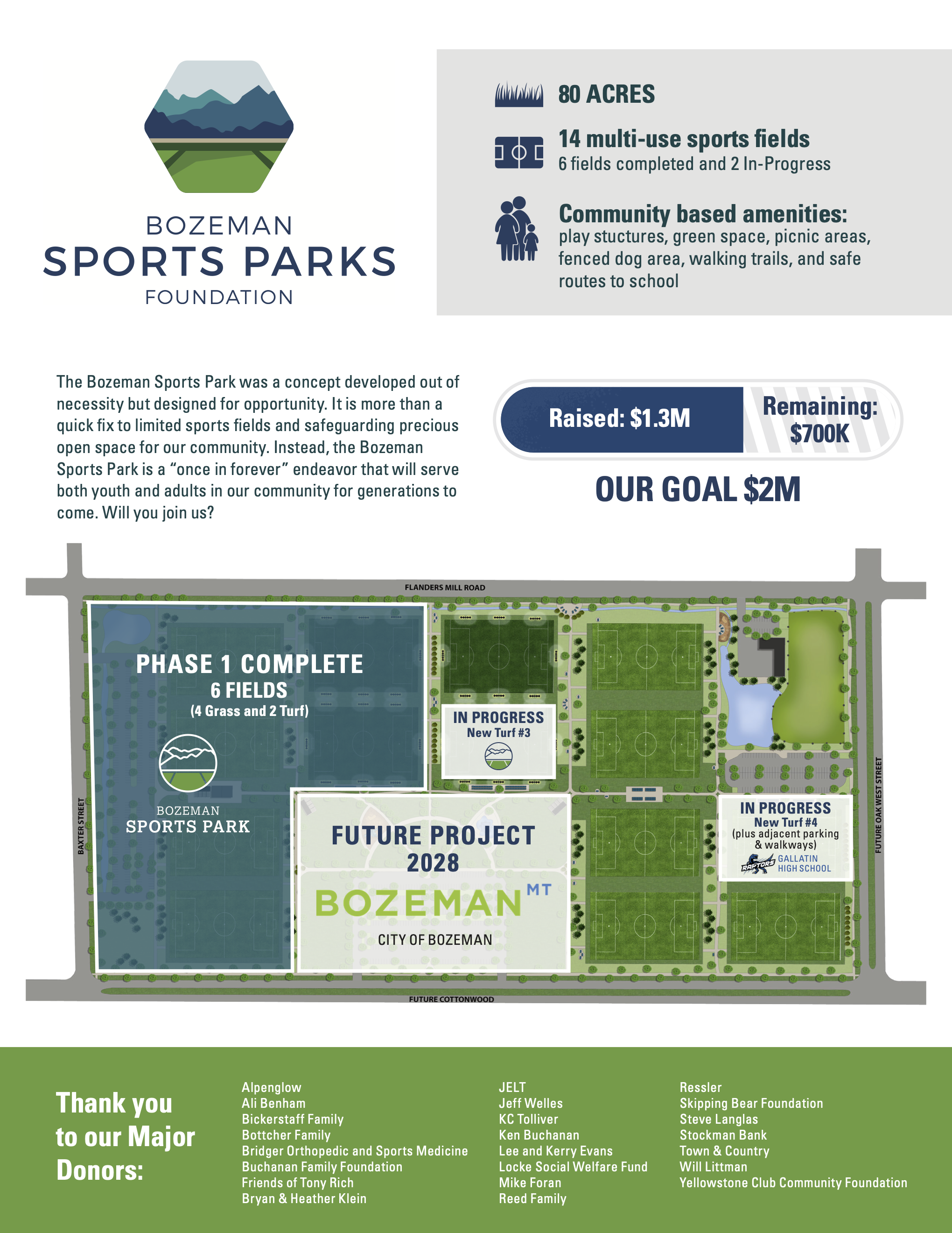 If you are interested in more detailed information on the project or how you can support the Bozeman Sports Parks Foundation, please let us know. We look forward to hearing from you!